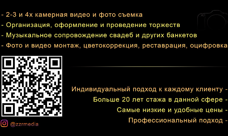 Съёмка в формате Full HD и 4K, различные сценарии монтажа (свадьбы, клипы, треки, репортажи, интервью).